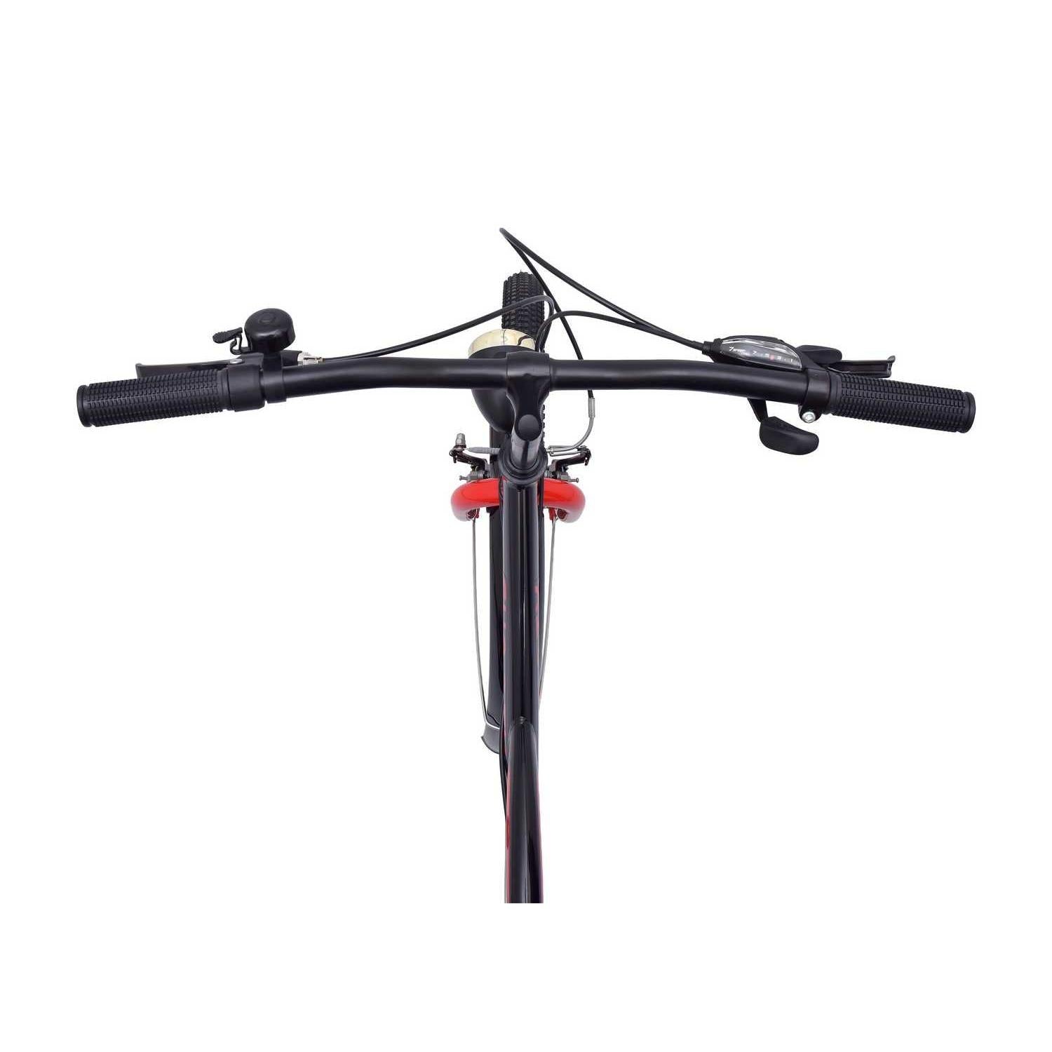 700x38C hybrid tires with front suspension absorb shocks, offering comfort and control on rough roads.